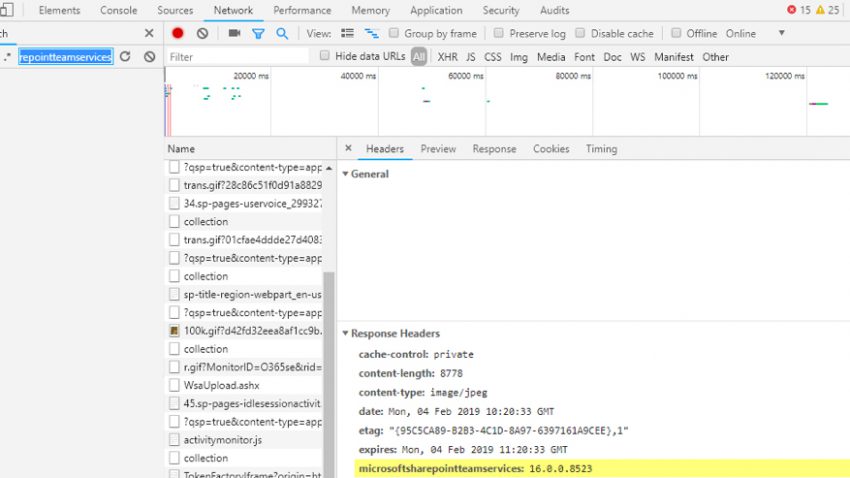 💡 If you're still unsure, check out the HTTP response header for MicrosoftSharePointTeamServices and compare it to this guide. To do this, browse to your SharePoint site, bring up the development console (by pressing F12) and search for ‘MicrosoftSharePointTeamServices’.