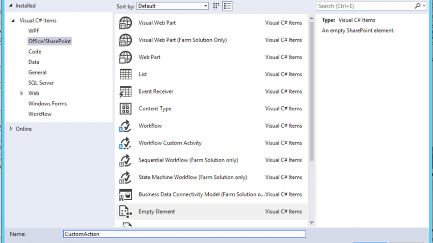 5. Select Empty Element and name it CustomAction.