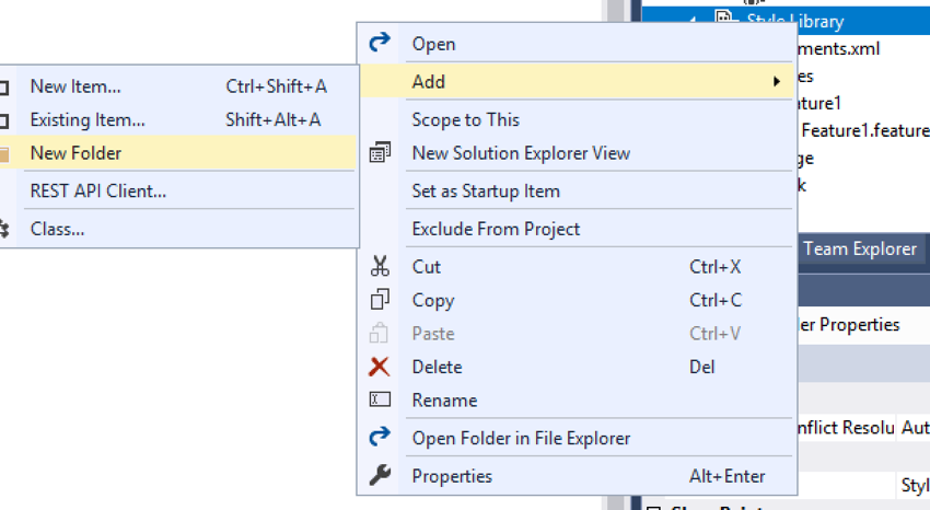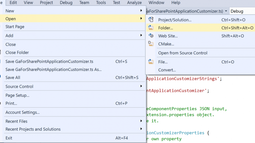 3. Open the project in Visual Studio by selecting Open > Folder … > {Location of the saved project above in step 1}.