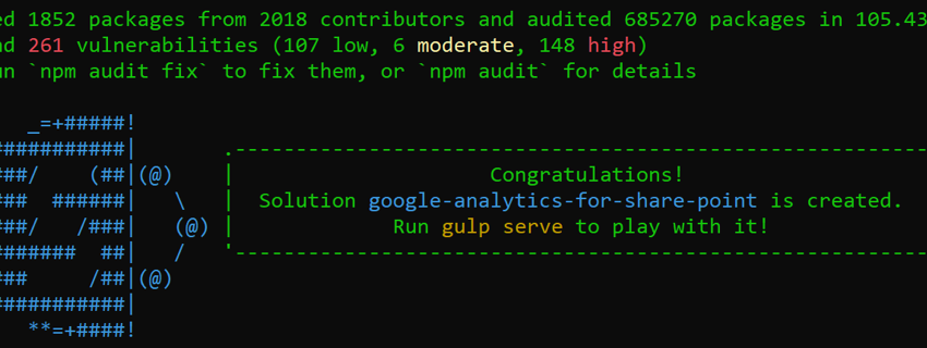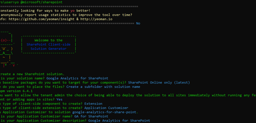 Connect-PnPOnline -UseWebLogin -Url https://changeme.sharepoint.com15. Now, enable the extensions by running the following command, remembering to change the UA Tracking ID to the one you received from Google when creating the Analytics Account, along with the ID Guid from your project found in manifest.json.