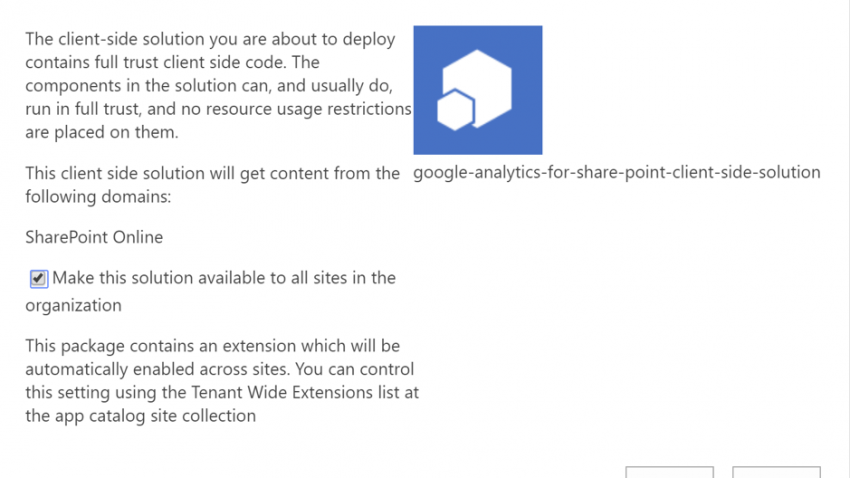 13. Click ‘New’ and select the package location from step 7. Check the "Make this solution available to all sites in the organization" box and click Deploy.