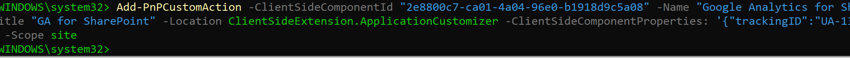 Add-PnPCustomAction -ClientSideComponentId "id guid" -Name "Google Analytics for SharePoint" -Title "GA for SharePoint" -Location ClientSideExtension.ApplicationCustomizer -ClientSideComponentProperties: '{"trackingID":"UA-change-me"}' -Scope site
